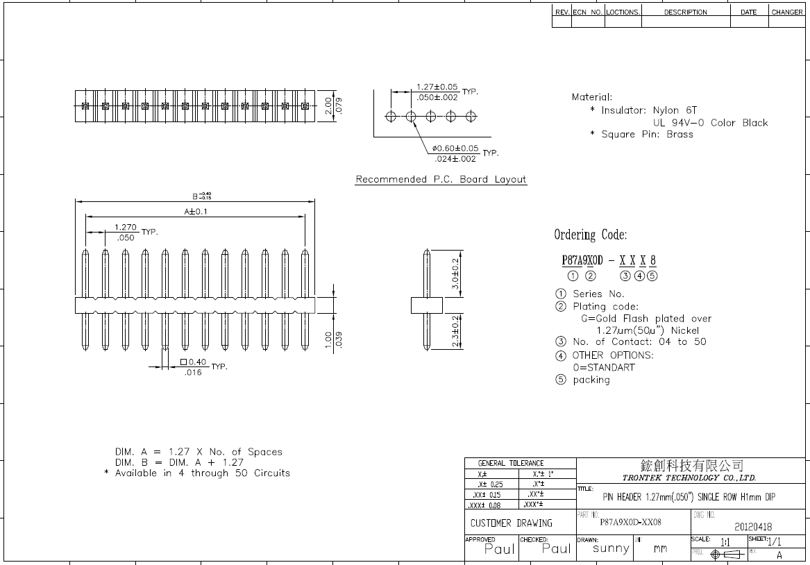 規格Current Rating: 1A AC, DC Voltage Rating: 250V AC, DC Temperature Range: -25 deg C ~ +85 deg C Contact Resistance: 20m Omega Max. Insulation Resistance: 5,000M Omega Min. Withstanding Voltage: 500V AC/minute 1.27mm Pitch PIN HEADER SMT , DIP Connector 此系列有單排、雙排、DIP及SMT的型式可客製化 實際產品規格與細節請洽本公司業務確認 產品規格